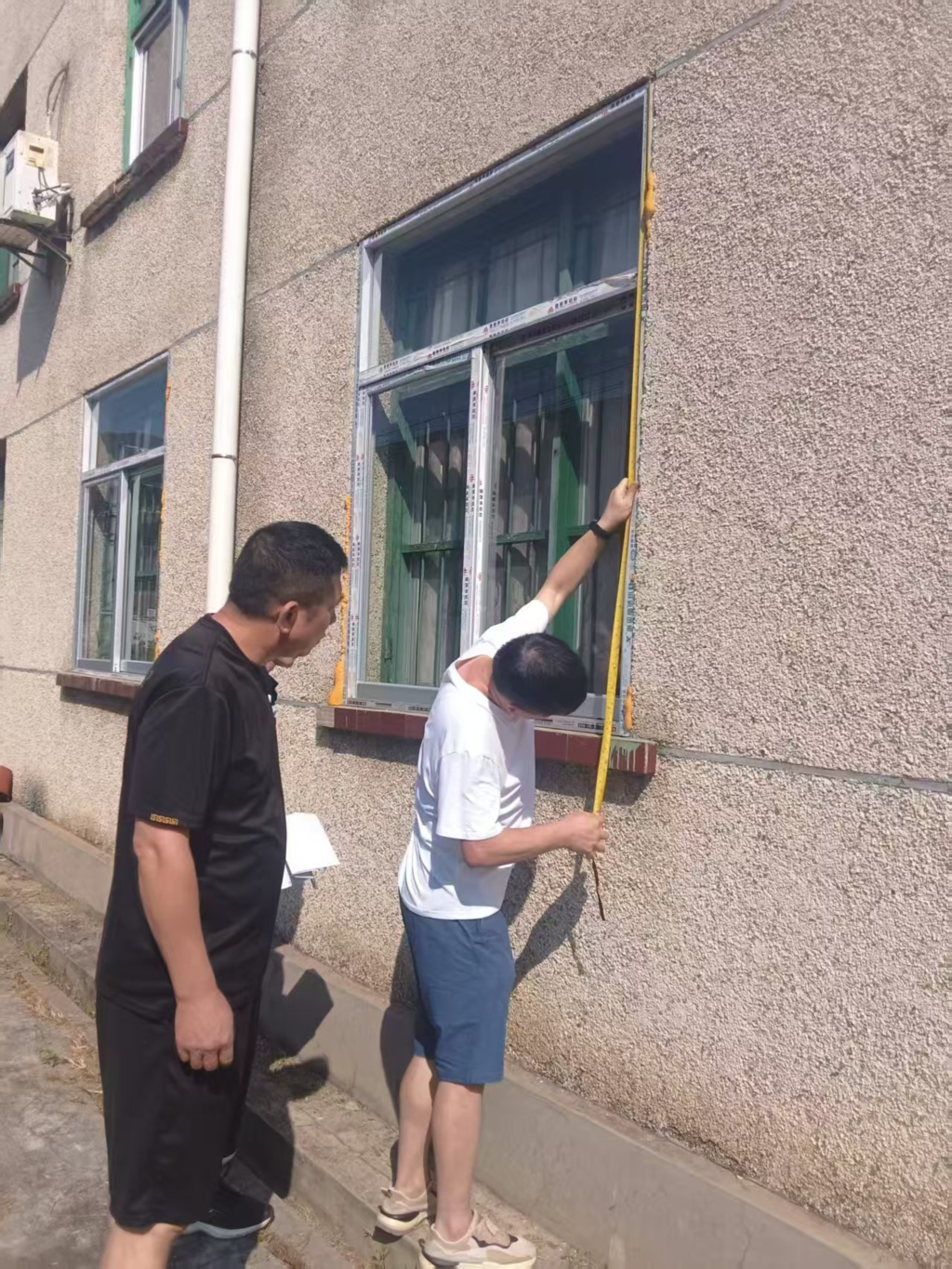 图为中心工作人员手持钢卷尺,在瓦窑坪生活区对新安装窗户进行严格测量的验收现场。(郑玮 熊赐添)